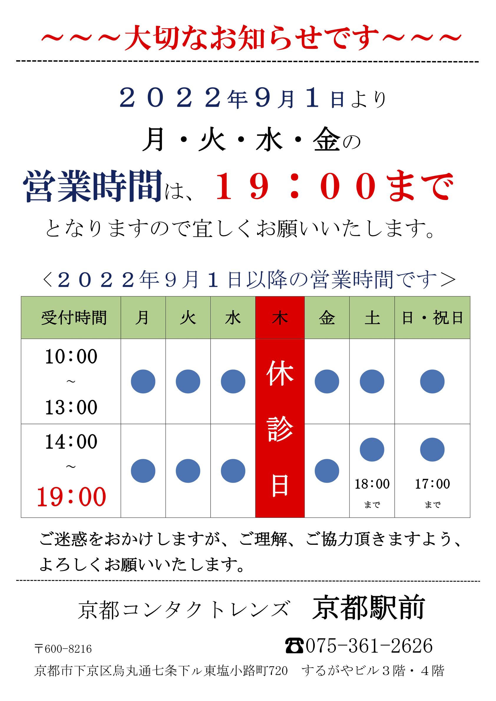 京都駅前 営業時間変更のお知らせ